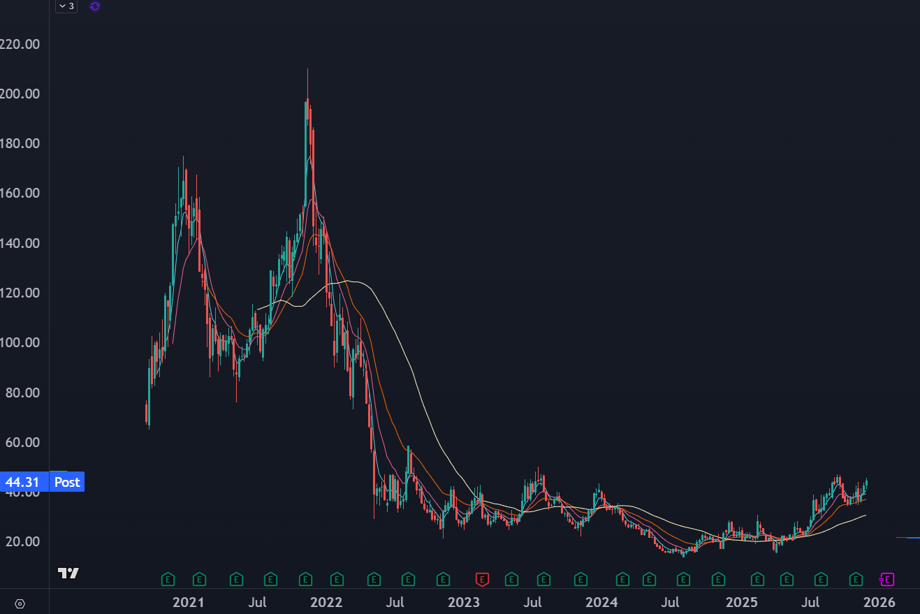Unity (U) is another one with a monster base and an AI layer trade. Sellers have shown up at $47 for years, and this may be the time the breakout finally sticks.