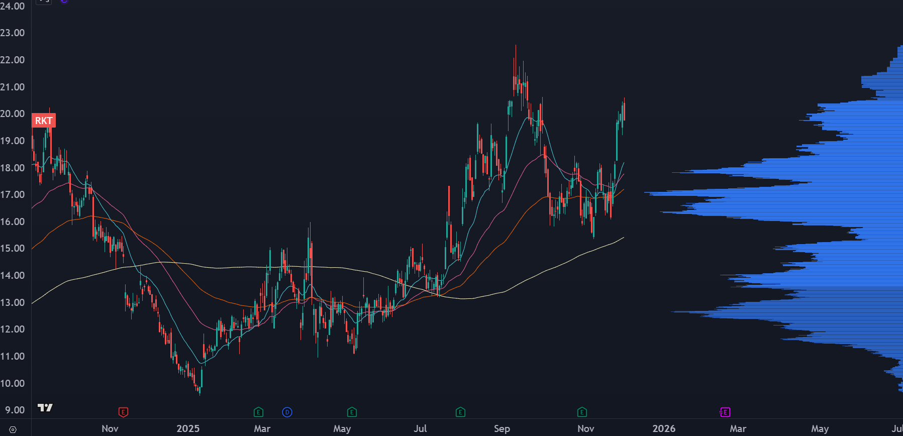 Rocket Mortgage (RKT) is taking a shot at the summer highs, with some juicy tailwinds surrounding the Fed balance sheet and more (potential) rate cuts. If it manages to stick, then this can run to $25 into next year. Our March $22 calls are about a double from calling them out on November 23rd.