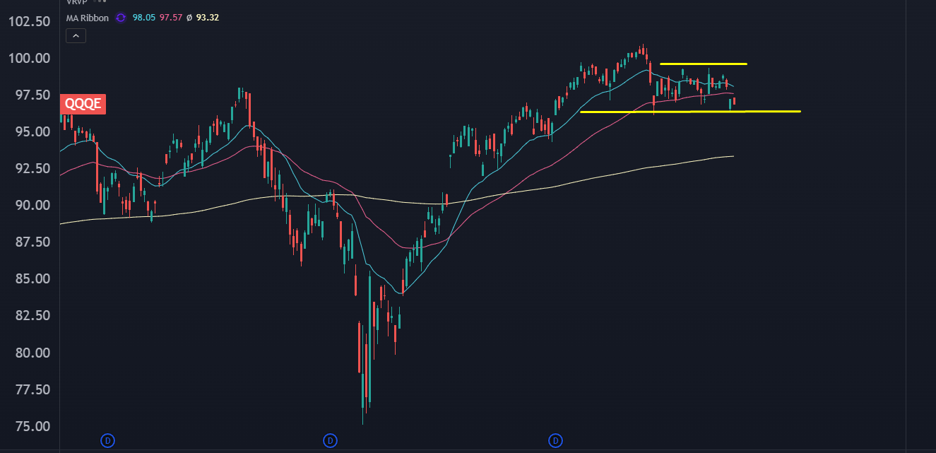The first bucket is the tech complex. This goes beyond QQQ. In fact, a better view of the health of the market leaders is to look at the equal weight Q’s, ticker QQQE: