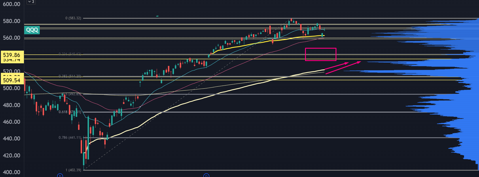A correction with a lower case “c” is about 4% under the 20 EMA. That’s sitting at about 570, so downside target would be $547. That would be an undercut of the Jul/Aug support levels.