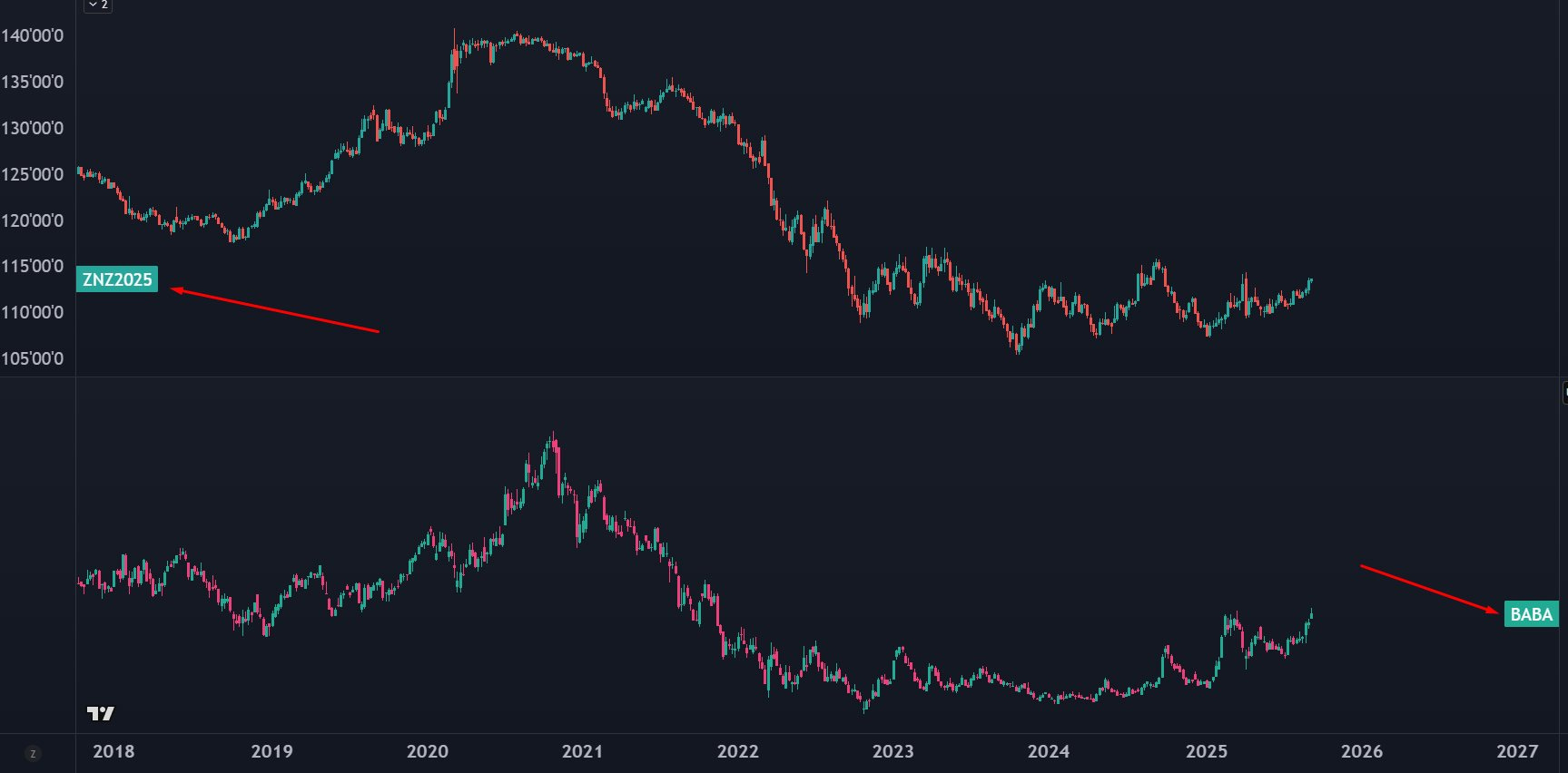 The top chart is the 10 year treasury, the bottom is in BABA.