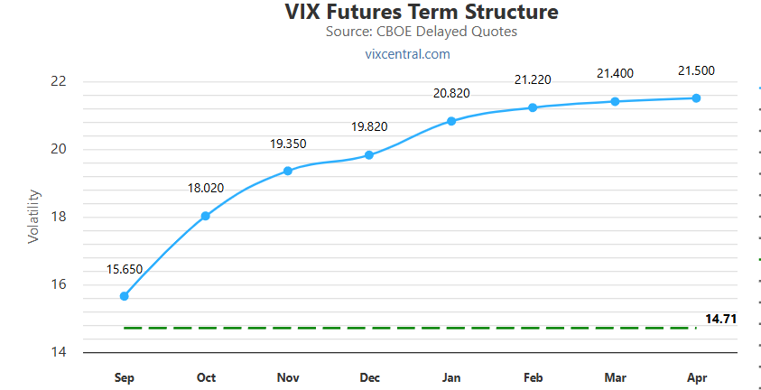Spot is trading at 14, front month VIX future is still at a decent premium, and the October future is still at 18.