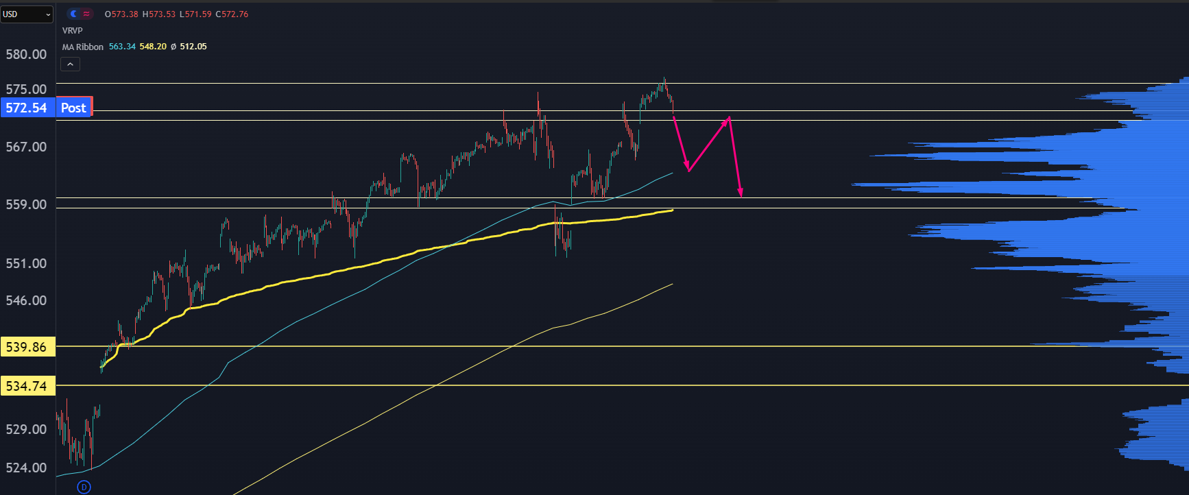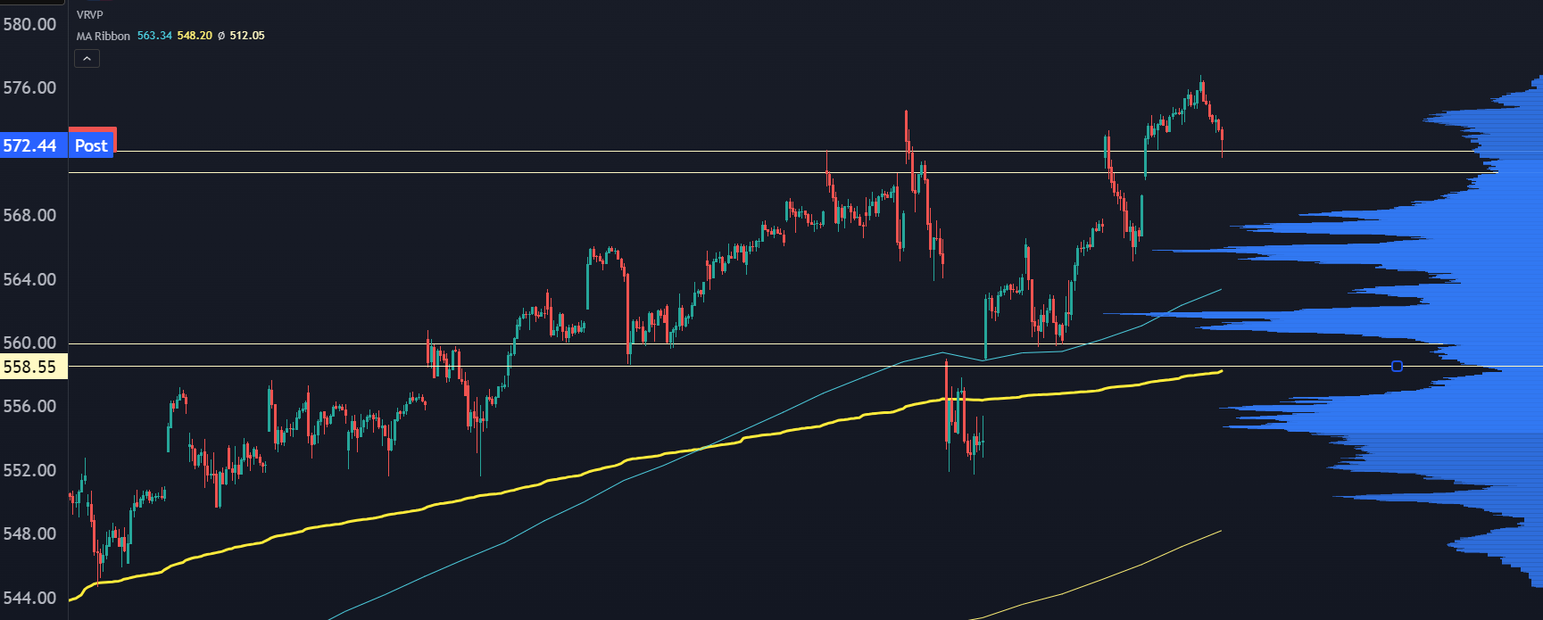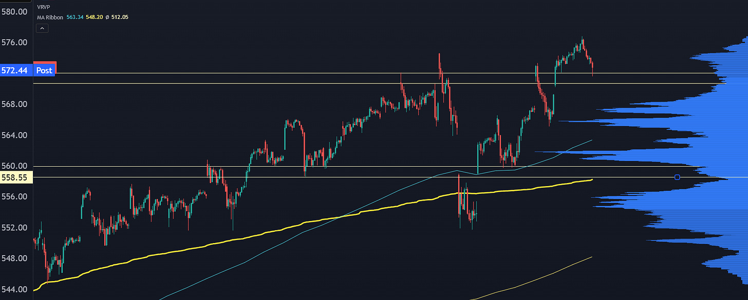 There’s the possibility of a failed breakout here. All of the prior pushes above $570 were met with sellers, and if it weren’t for AAPL’s run the market’s structure would have already flashed a failed auction.