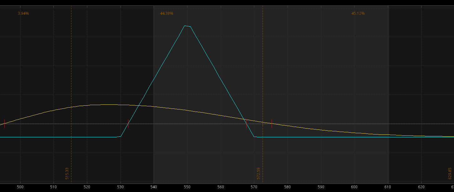 This trade pays out if there’s an attempt to takeout the recent lows. I think if we do selloff into 550s, vol will come out of at the money options, which will benefit this trade even more. I did pick up this trade at 2.32, but I also have existing flys on at 500/520/540.