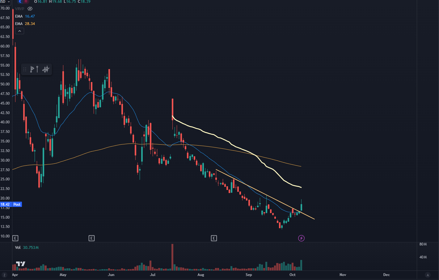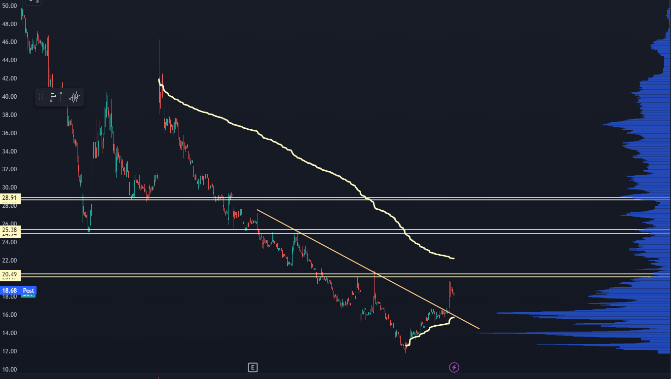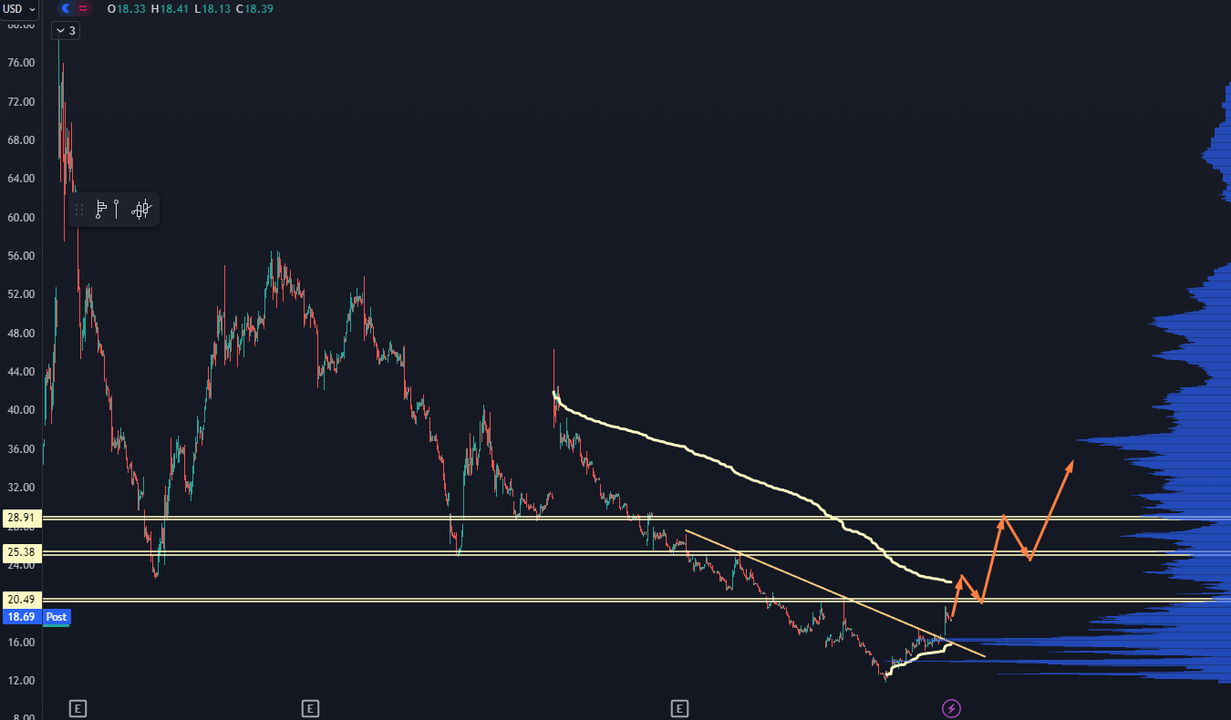 The top yellow squiggly line is the anchored volume weighted average price (AVWAP) against that high. If the stock price were to hold above that, it would signal a good change in trend.