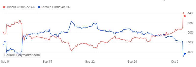 This screenshot is from Polymarket, a blockchain prediction site. Vice President Harris had a bump after doing the “hot swap” with President Biden, but that lead has been reversed and eliminated.