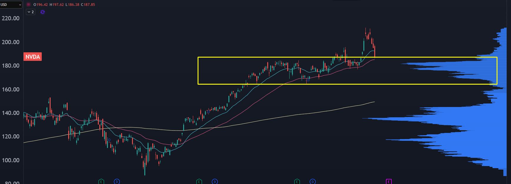 The majority of liquidity in NVDA is from the summer trading range. This last move was a blowoff with some deal news, and the stock has now come into the upper edge of this range.