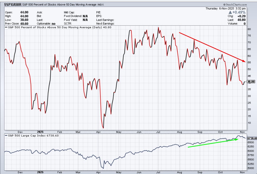 Here’s a chart of the percentage of S&P 500 stocks that are still above their 50: