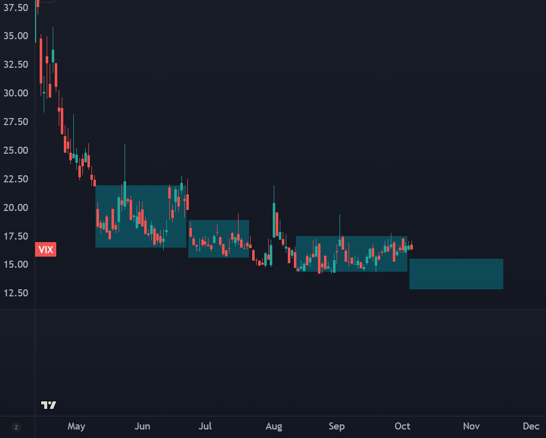 Part of the sticky bid in large cap tech has to do with the overhedging in index and VIX products. And the only way a sustainable top gets put in this market is if the VIX finally caves to pressure and establishes a new lower regime in 12-15 instead of 15-20: