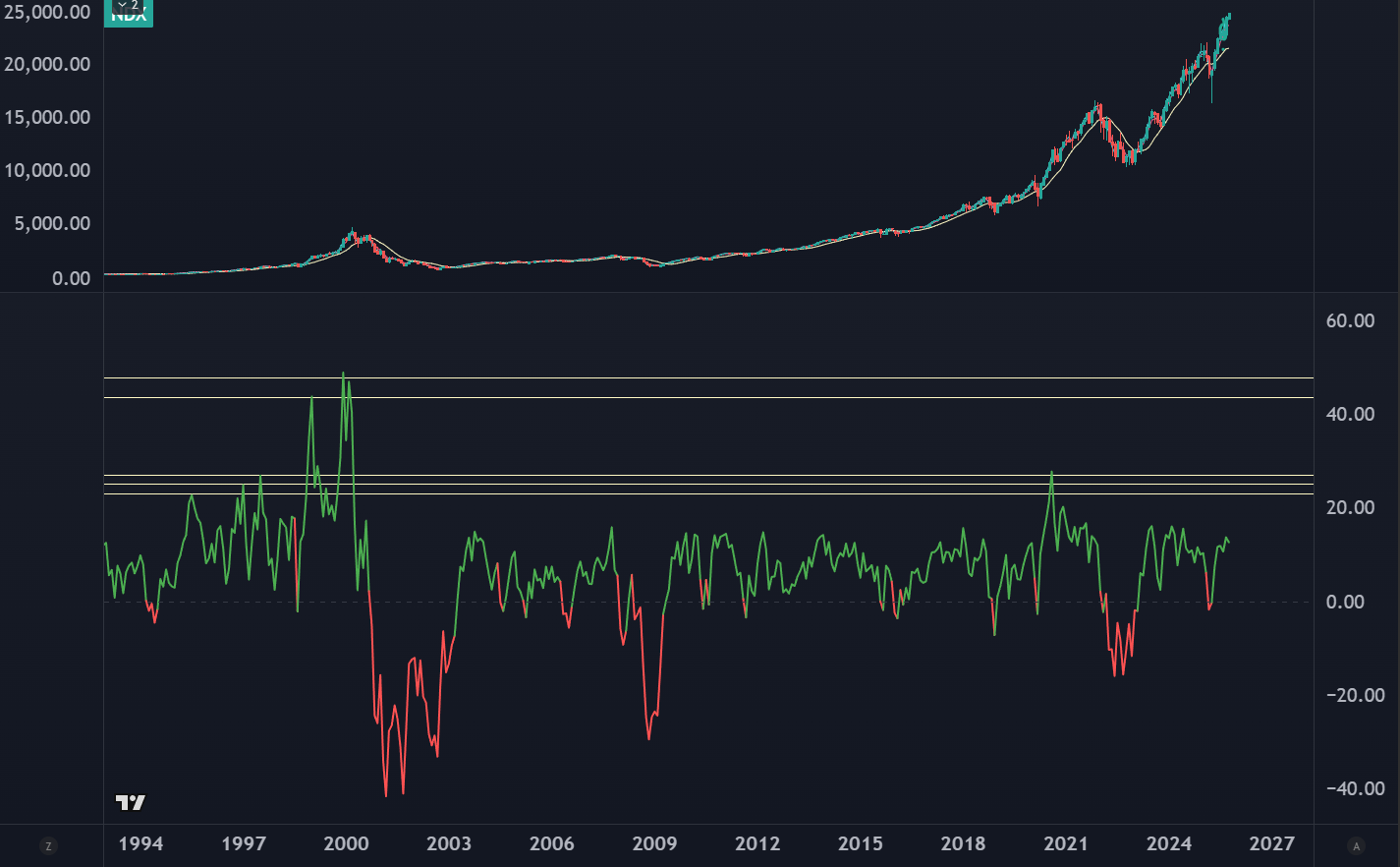 This is the Nasdaq with a disparity index, which shows you the percent distance between price and a key moving average. In this case we are looking at the percentage distance away from the 12 month average.