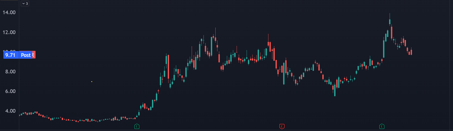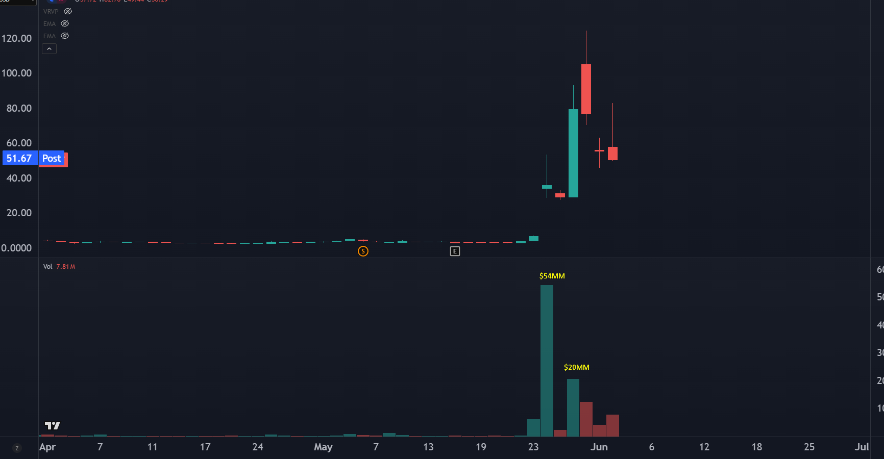 This stock gapped from $6 to $30 overnight. There was an announcement of a private investment of public equity (PIPE) of $425mm in order to buy Ethereum, a crypto token.