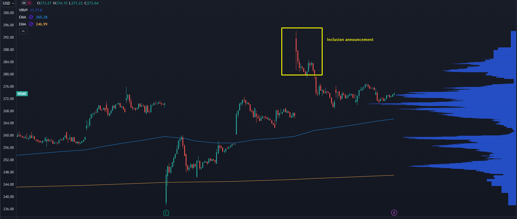 And if you pick the right horse, it can pay out big. Like what happened with Workday (WDAY) after it announced S&P 500 inclusion: