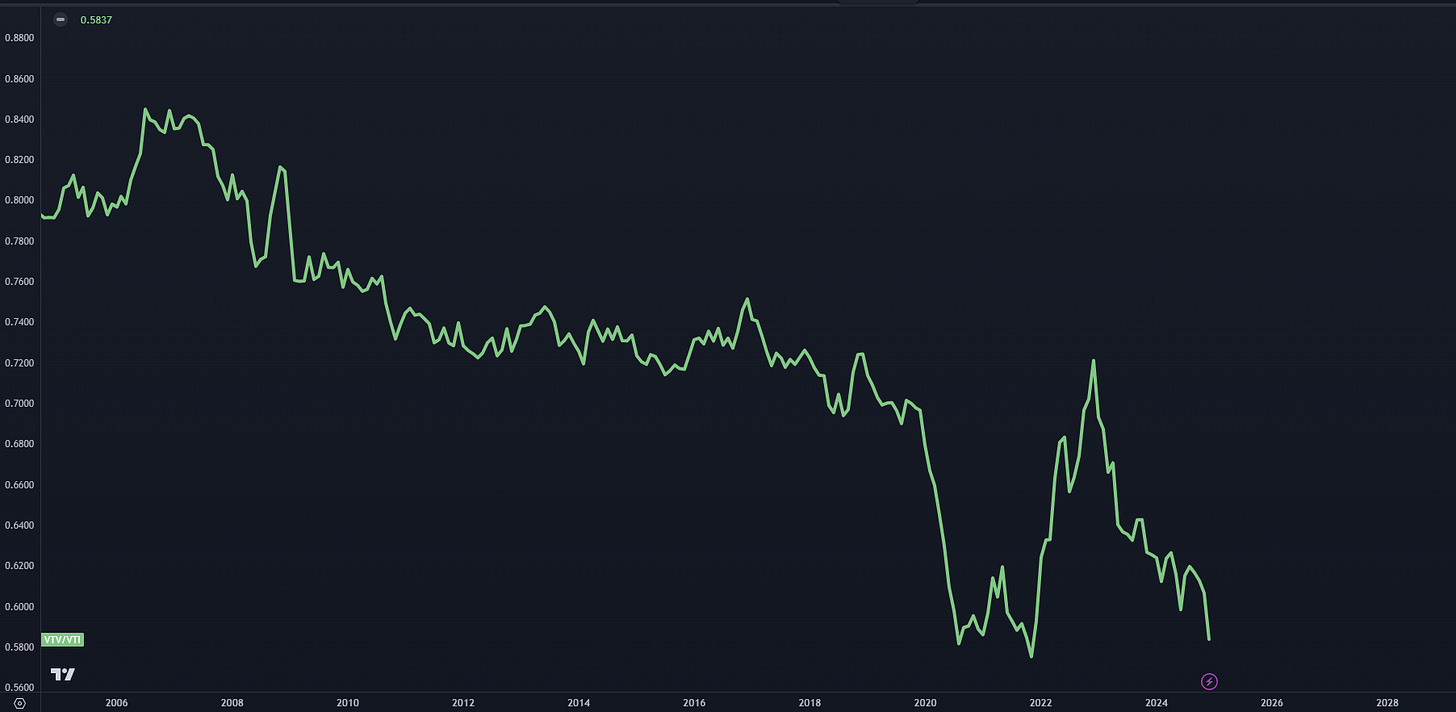 This is the relative performance of VTV (value) compared to VTI (broad markets) going back about 20 years: