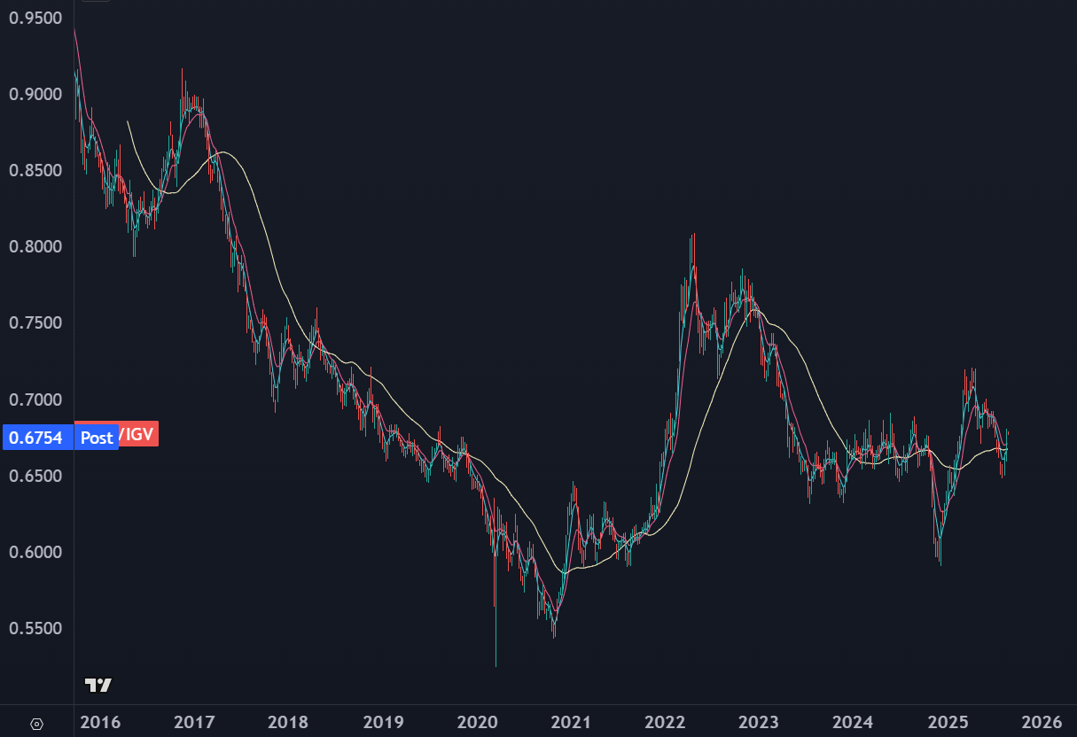 One way to view this relationship is the relative performance of cybersecurity (CIBR) to software (IGV):