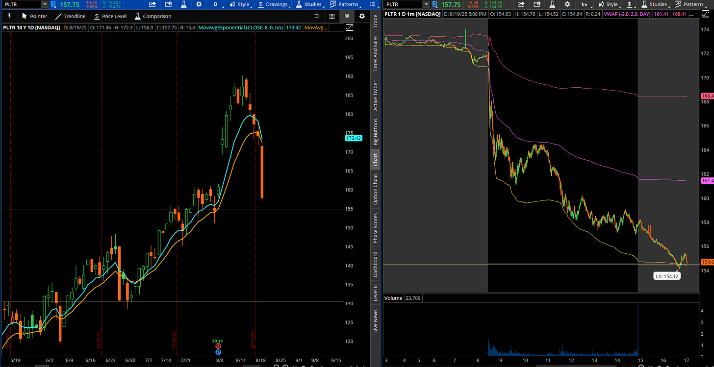 Palantir (PLTR) got taken to the woodshed today, a -3.4 standard deviation move. Sellers accelerated into the aftermarket session.