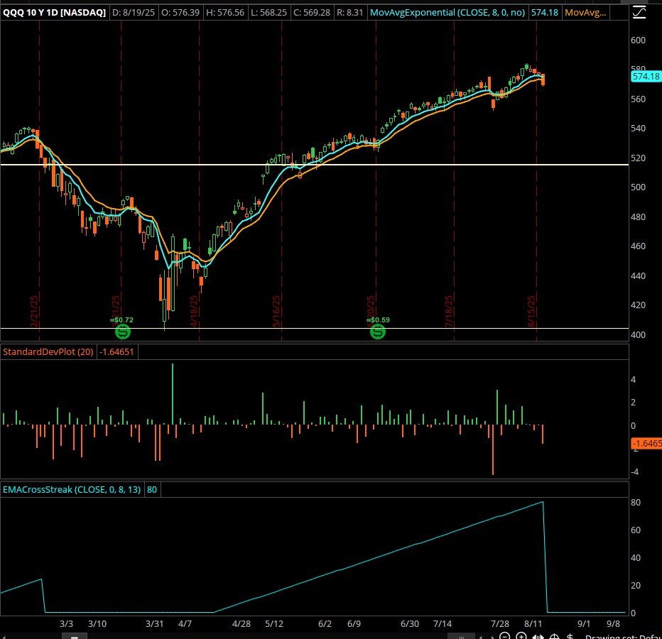These are small sample sizes and each was a unique situation, so don’t get all beared up just yet. Even with today’s selloff, the 8/13 cross is still in bullish alignment.