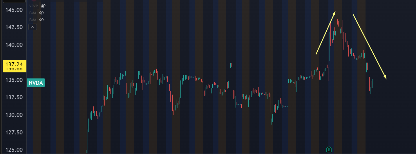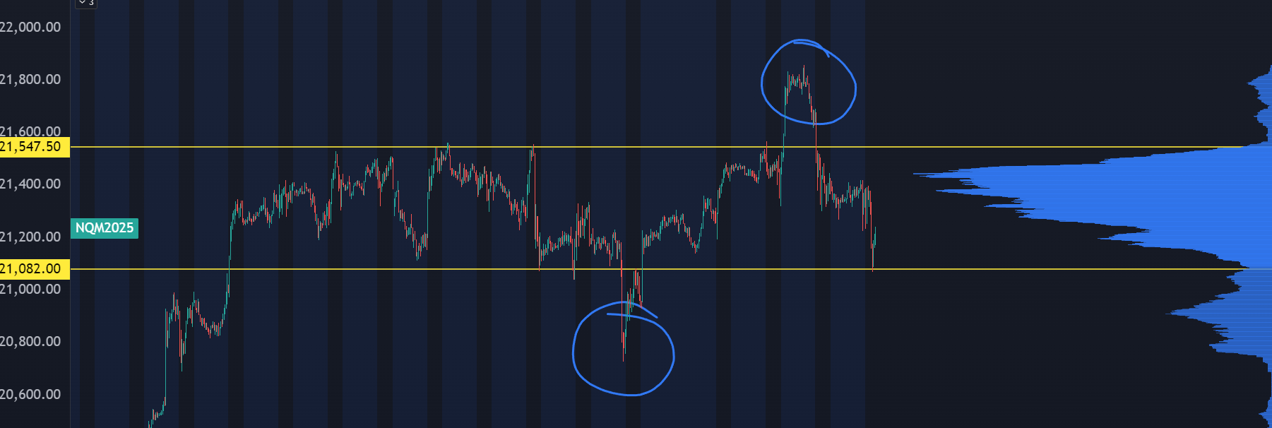 There’s been a few failed pushes on either side of the range. The failed breakdown had to do with some econ data or tariff news, and the failed breakout was the NVDA earnings fade.
