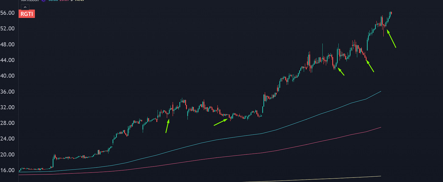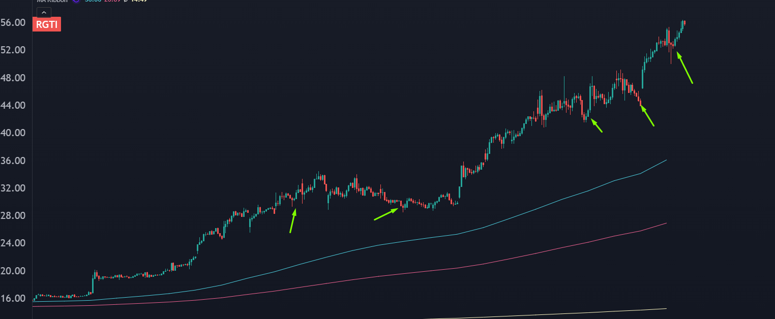 The green arrows on the RGTI 30 minute chart show some key decision points where the stock could have rolled over. Over the last few instances, there are lots of participants that think the stock should rollover.