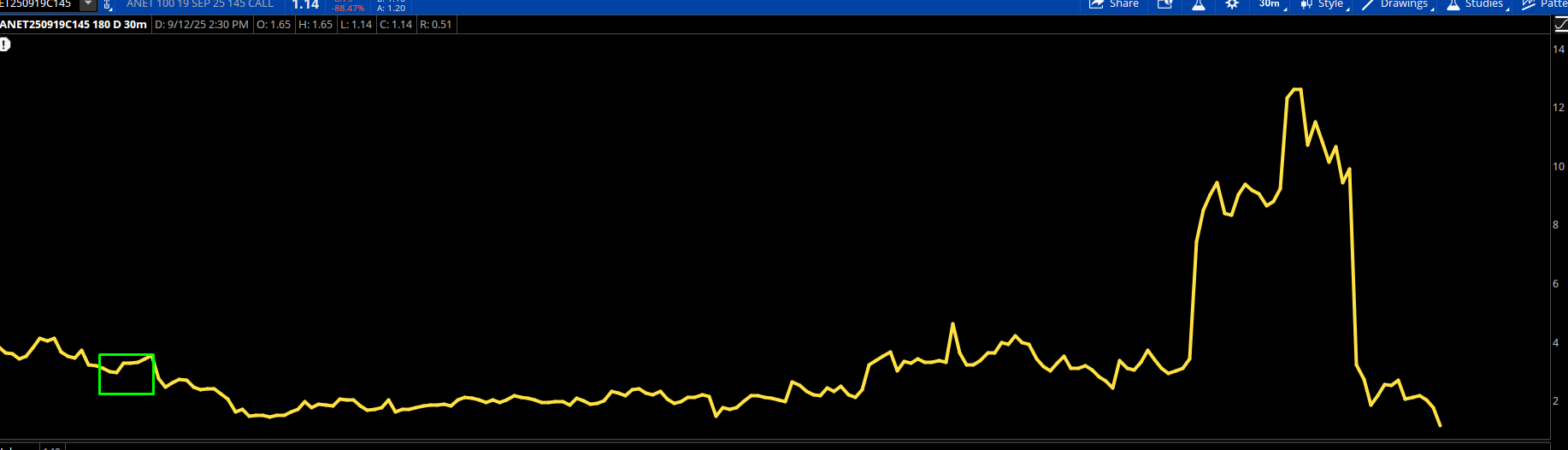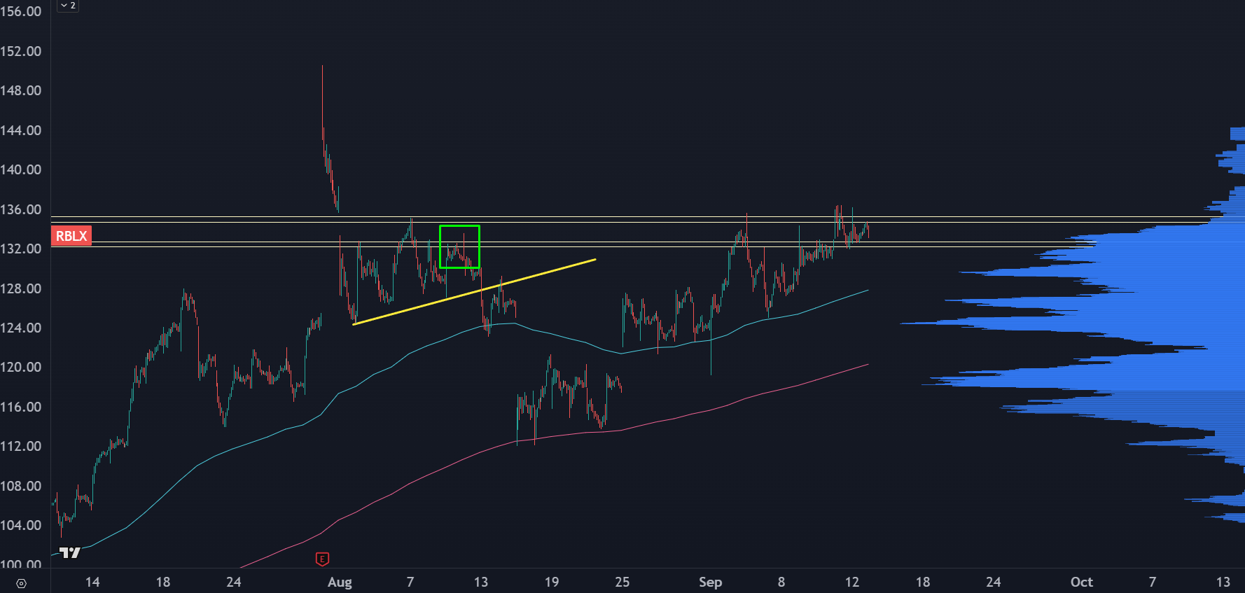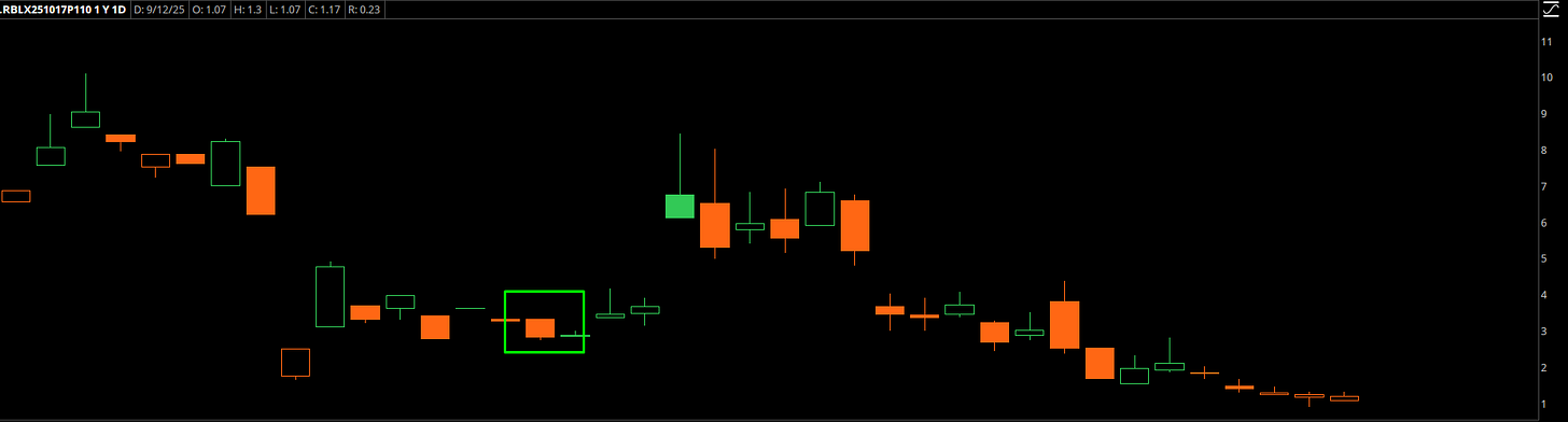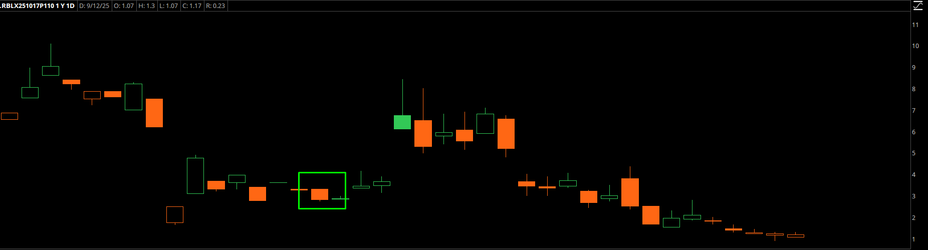 Roblox had a monster move on earnings that was faded aggressively, and then new resistance formed in the 130s. I noticed the failure to retake that, and I called out the October $110 Puts at $2.90.