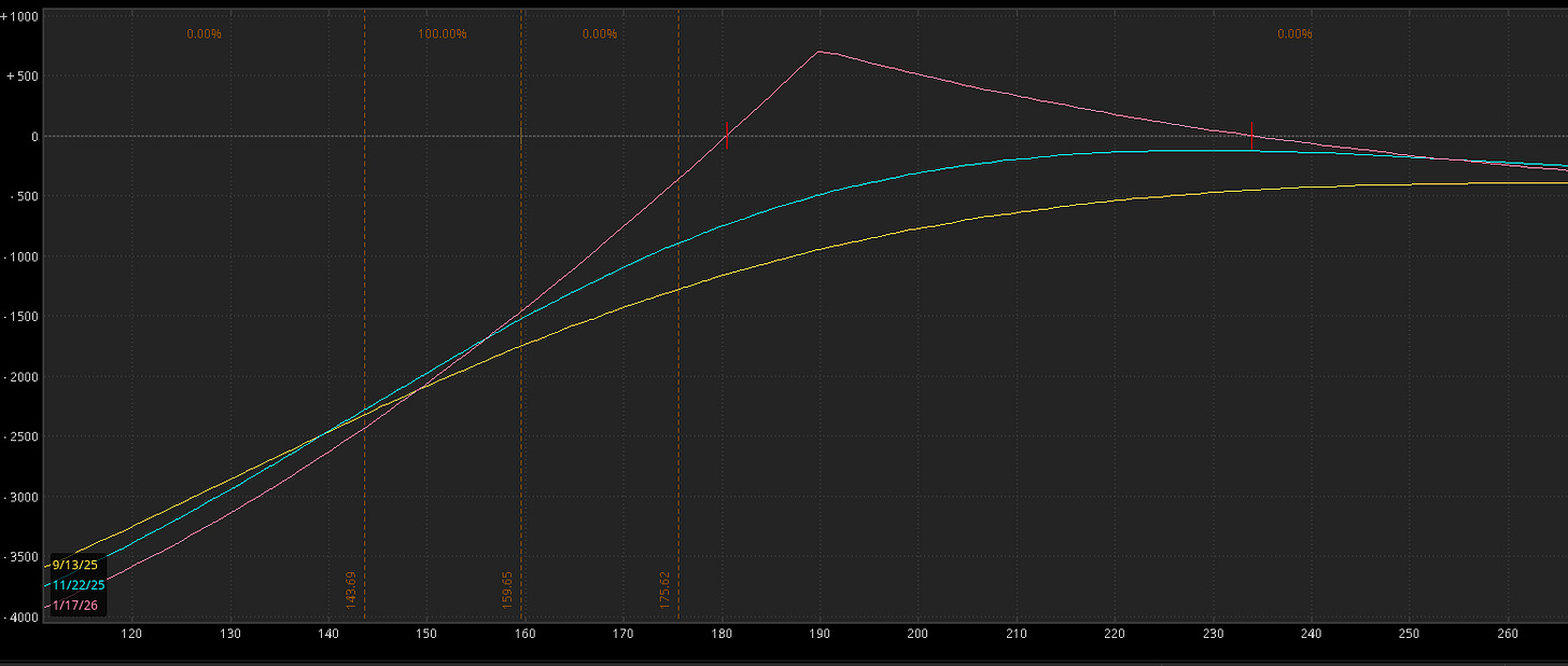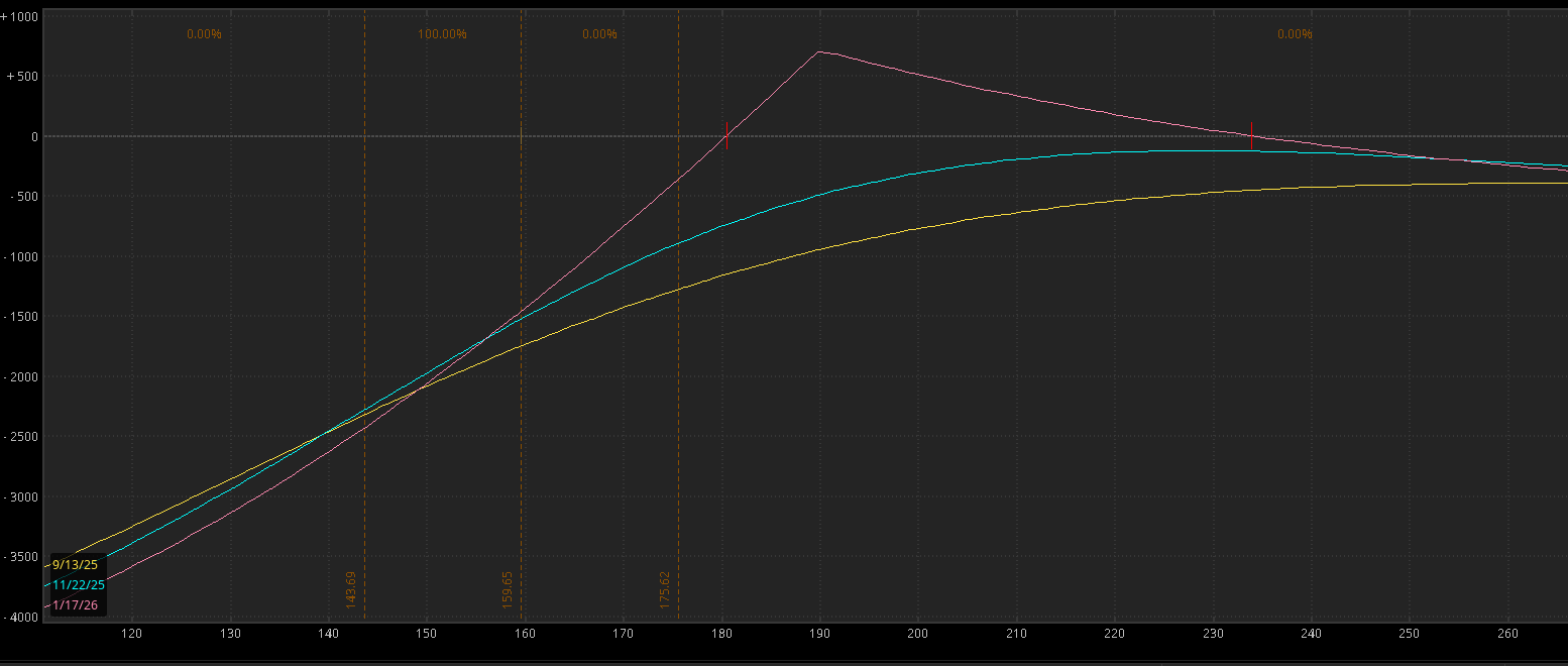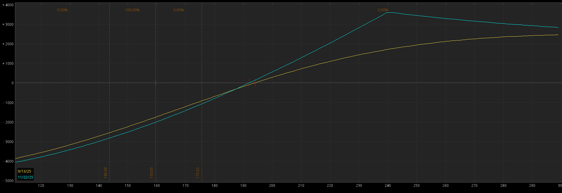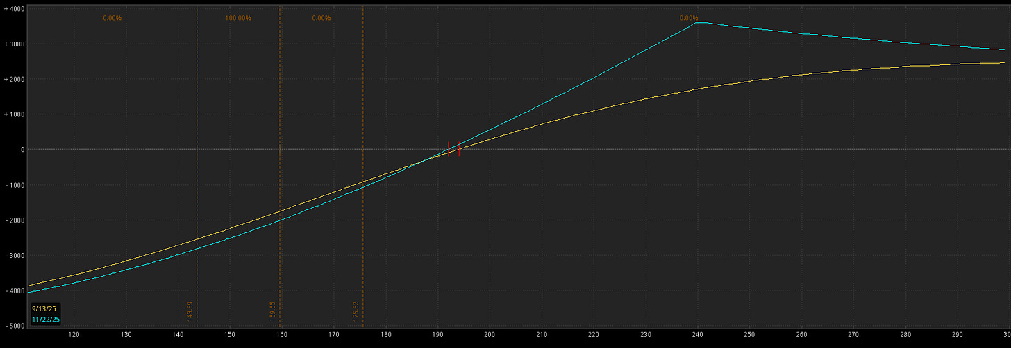 If you roll the Nov $240 calls out to the Jan $190 calls, and then roll the Dec26 $180 calls down to the $155 calls, then the trade evolves to look like this: