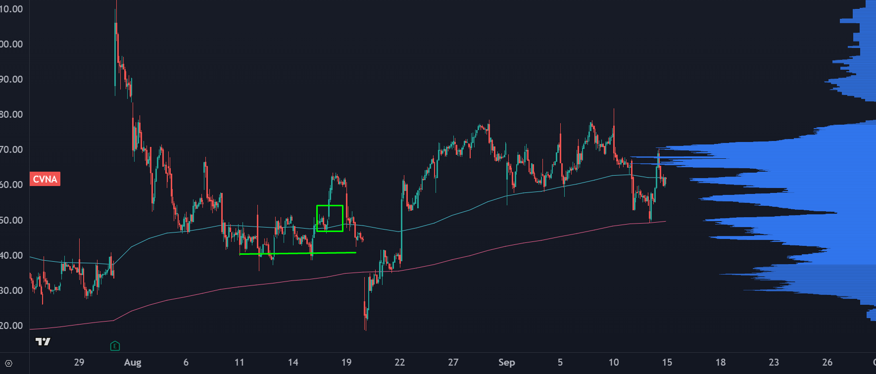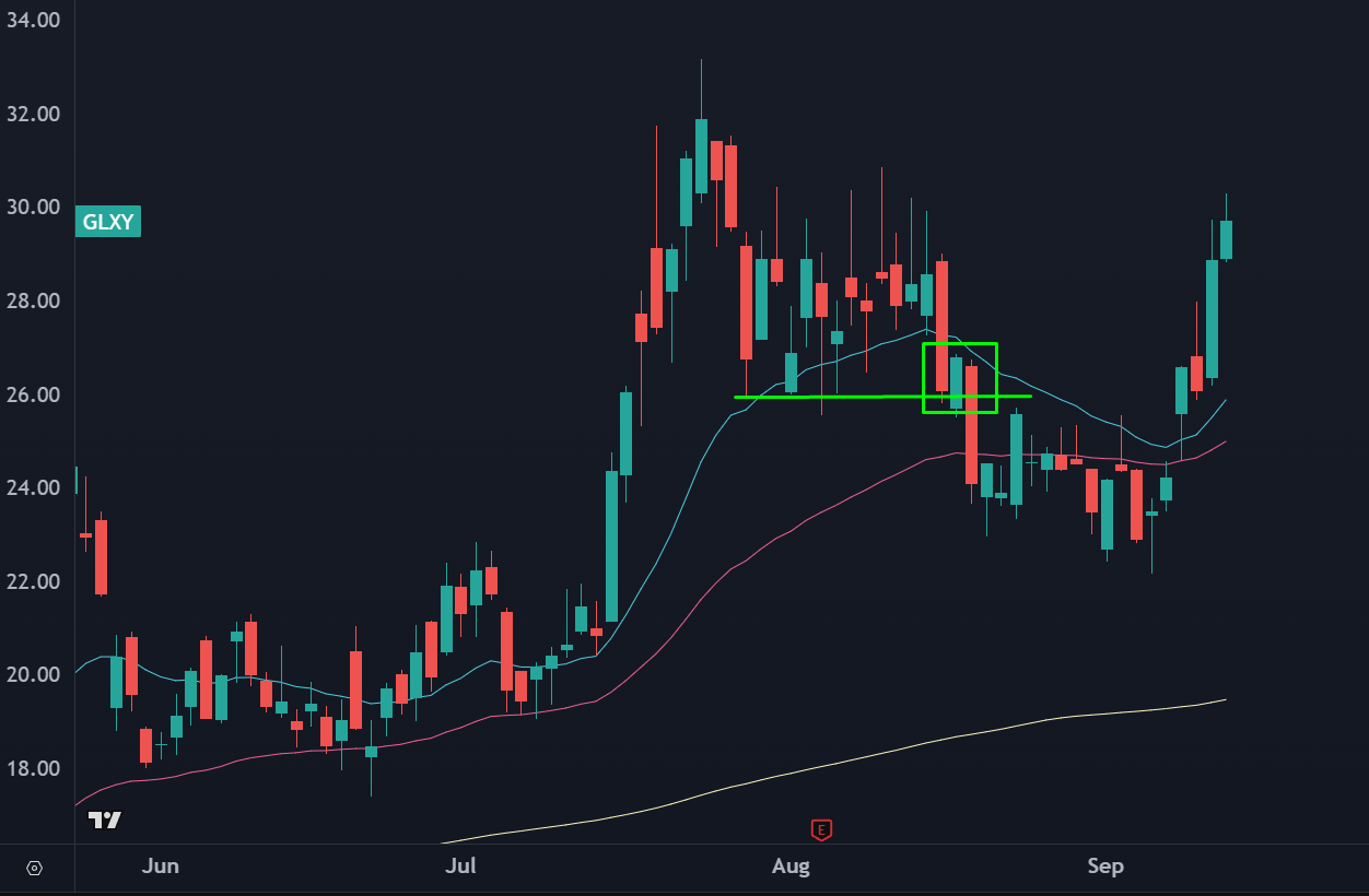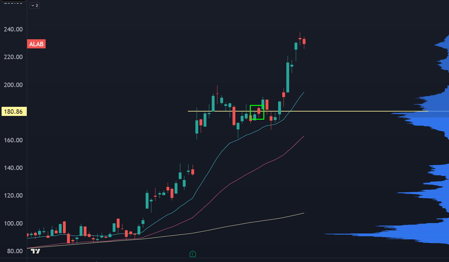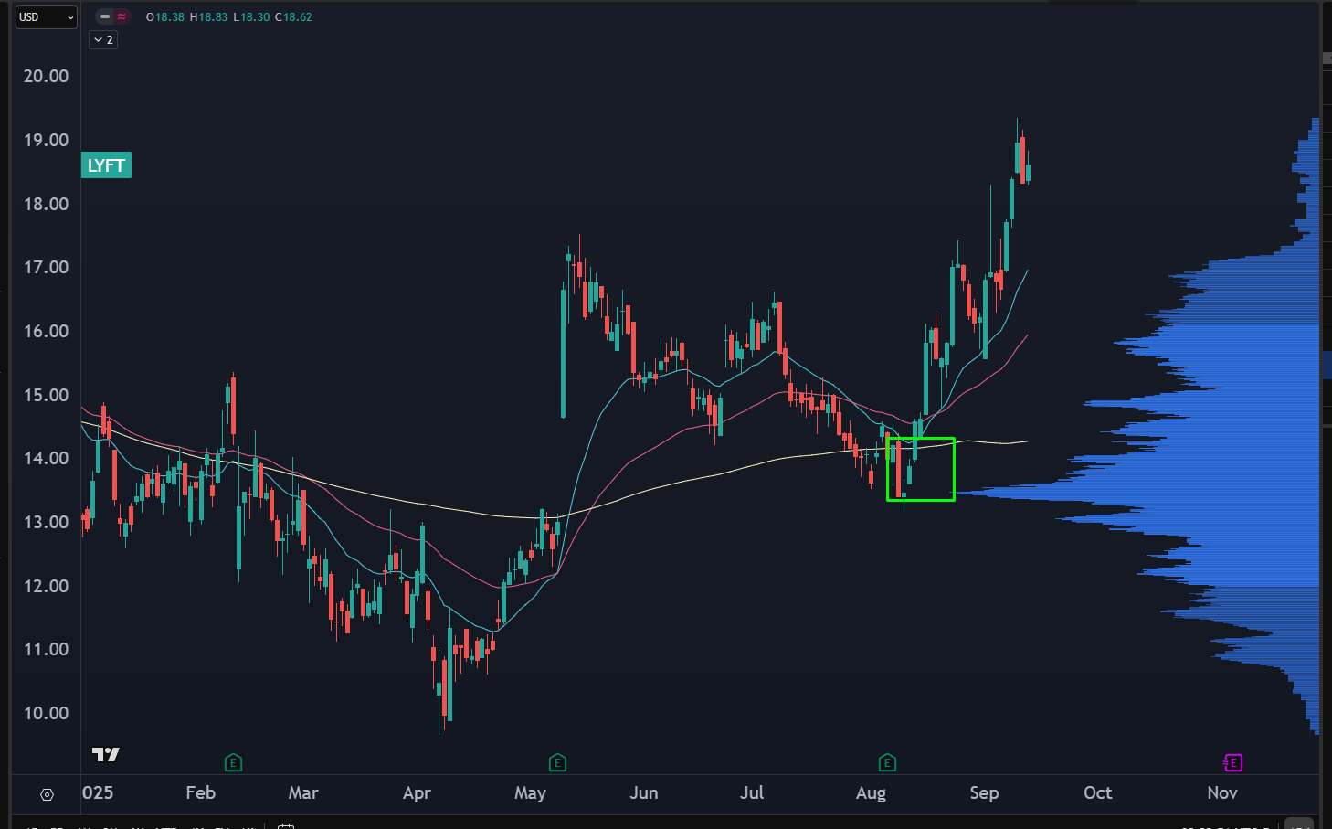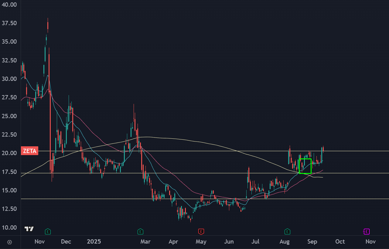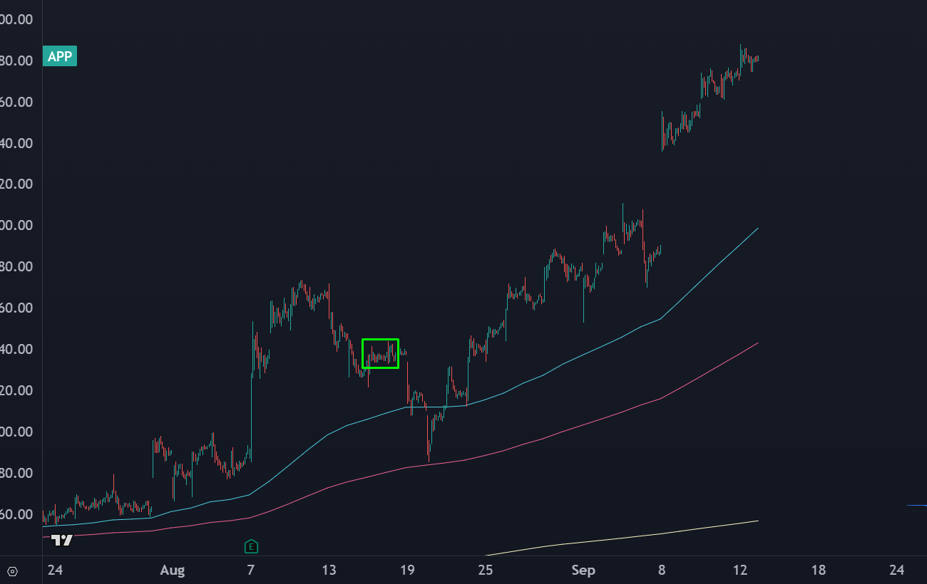 I had an internal pivot level that I was expecting to clear out and see some momentum. It did for a day or two, gapped down into the 20EMA, and then reclaimed it before going on a monster run.