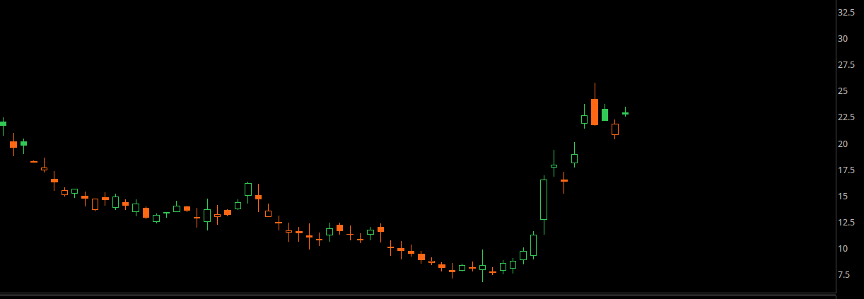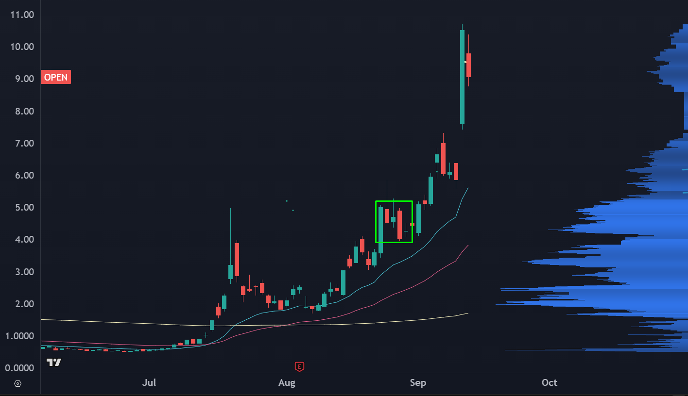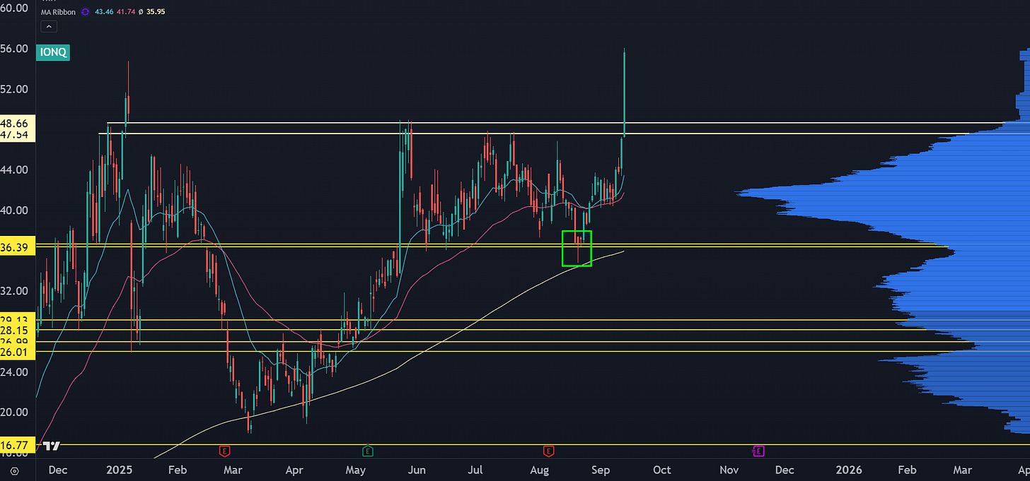 IONQ had been trading in a range for a while and broke underneath obvious support and was bid up aggressively. I was looking for a retest of the upper end of the range, and Friday’s breakout was the icing on top.