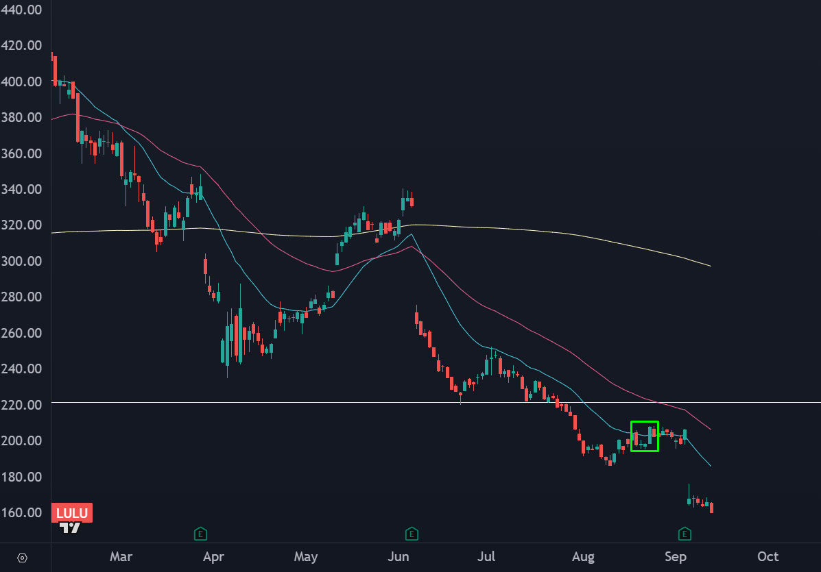 Longer term, LULU is coming into its 2020 lows and the range from 2019. I’m not expecting the stock to double overnight, but if it builds out a base, and you can continue to sell calls against LEAPs as the stock bases, then I think it will pay out big in about 6 months from now.
