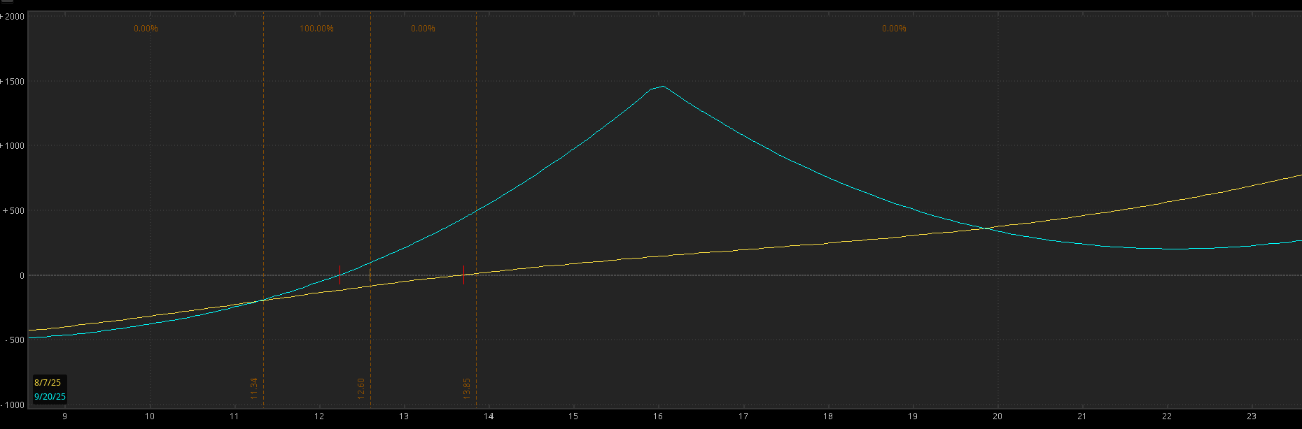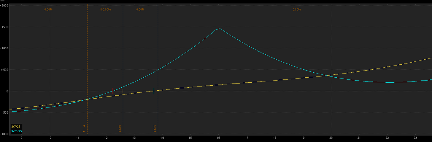 Could this trade workout? Sure, if there were a pullback into Sep opex. But a way to manage the trade would be to close the 10 Sep $16 calls, and then sell -13 Nov 20 Calls. It puts more cash on the table, but removes the margin and resets you into a bullish position: