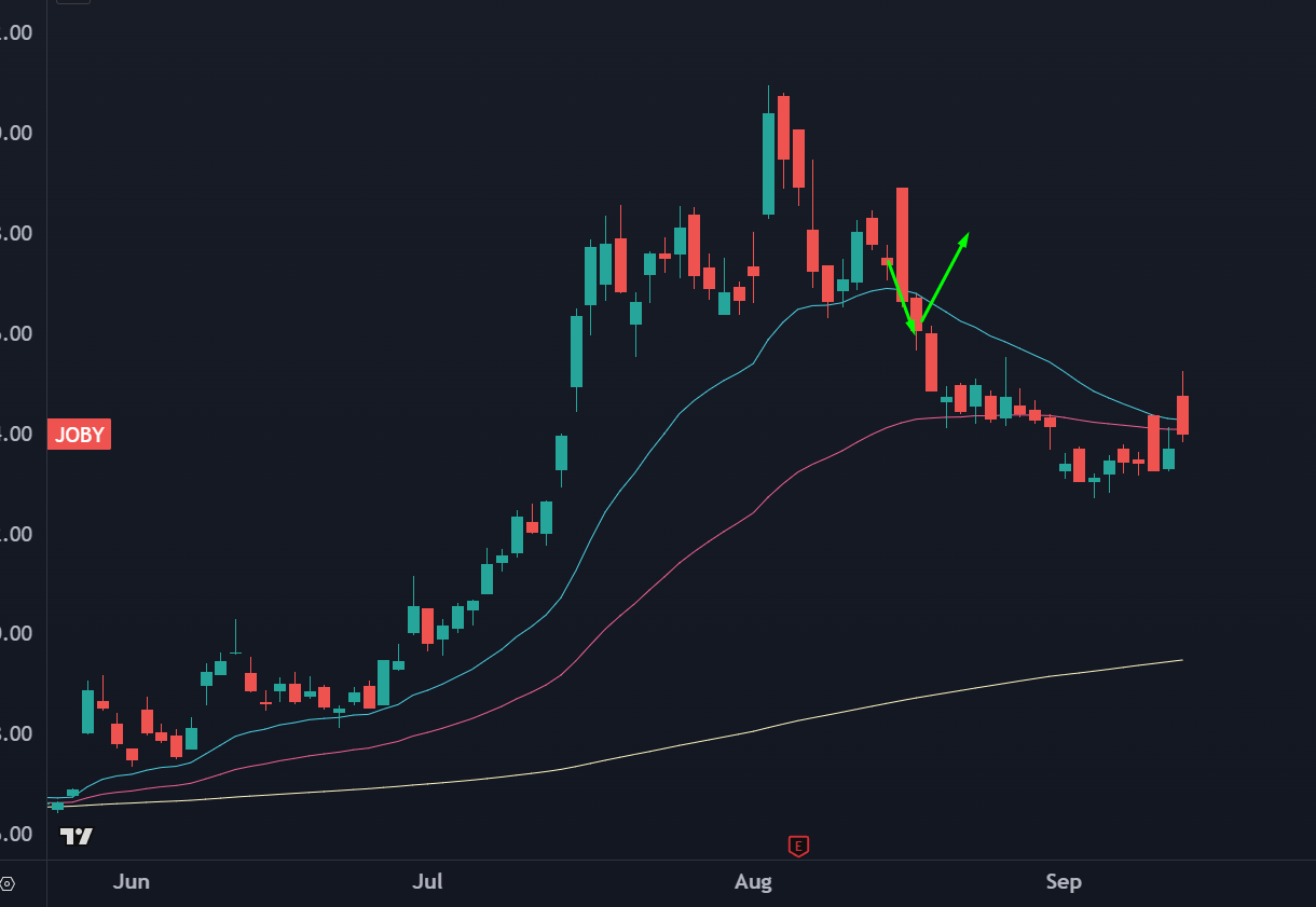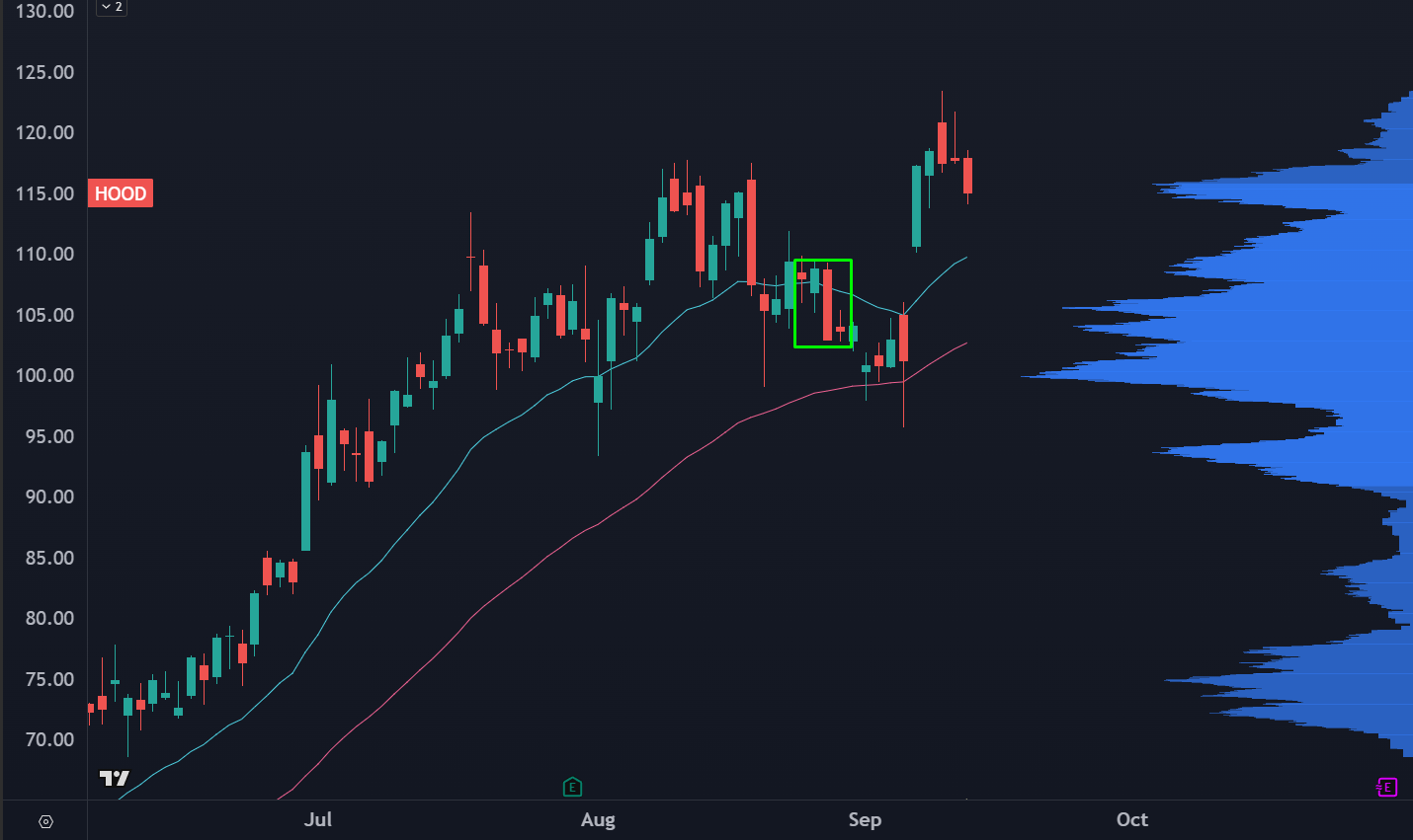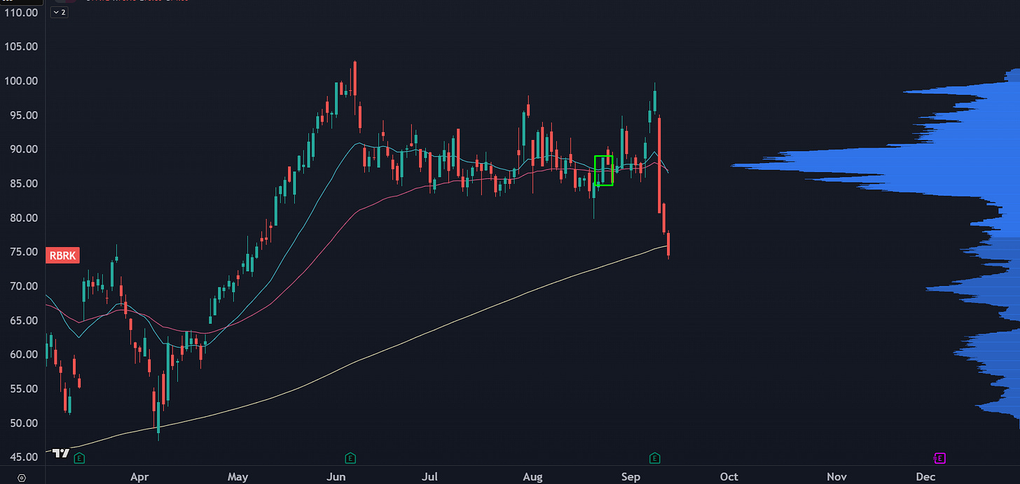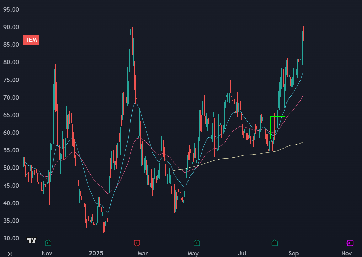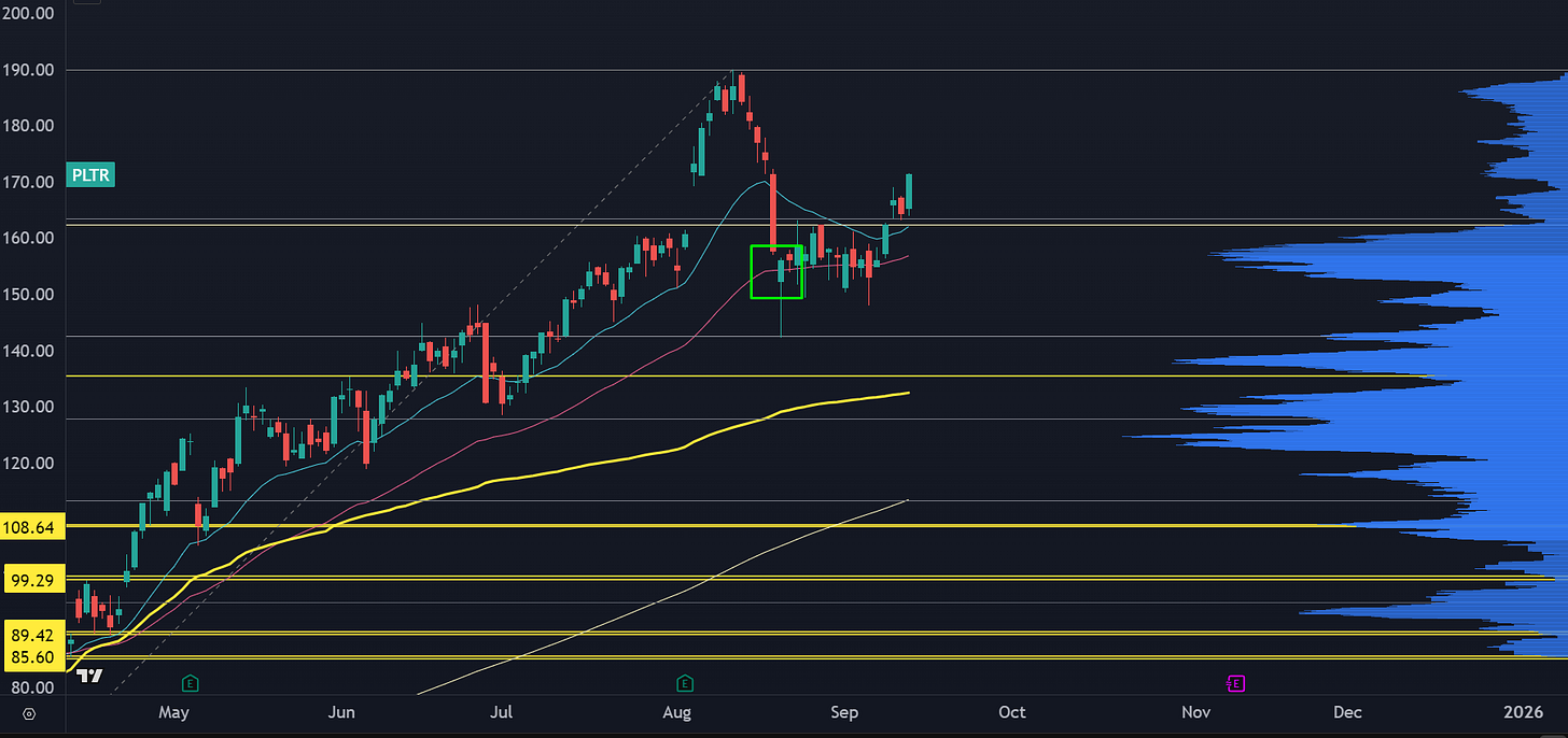 I was looking for a failed breakdown similar to IONQ. It had a test of the 20 EMA, and then reclaimed a big level. I recommended the Oct $100 calls, looking for the $100 roll.