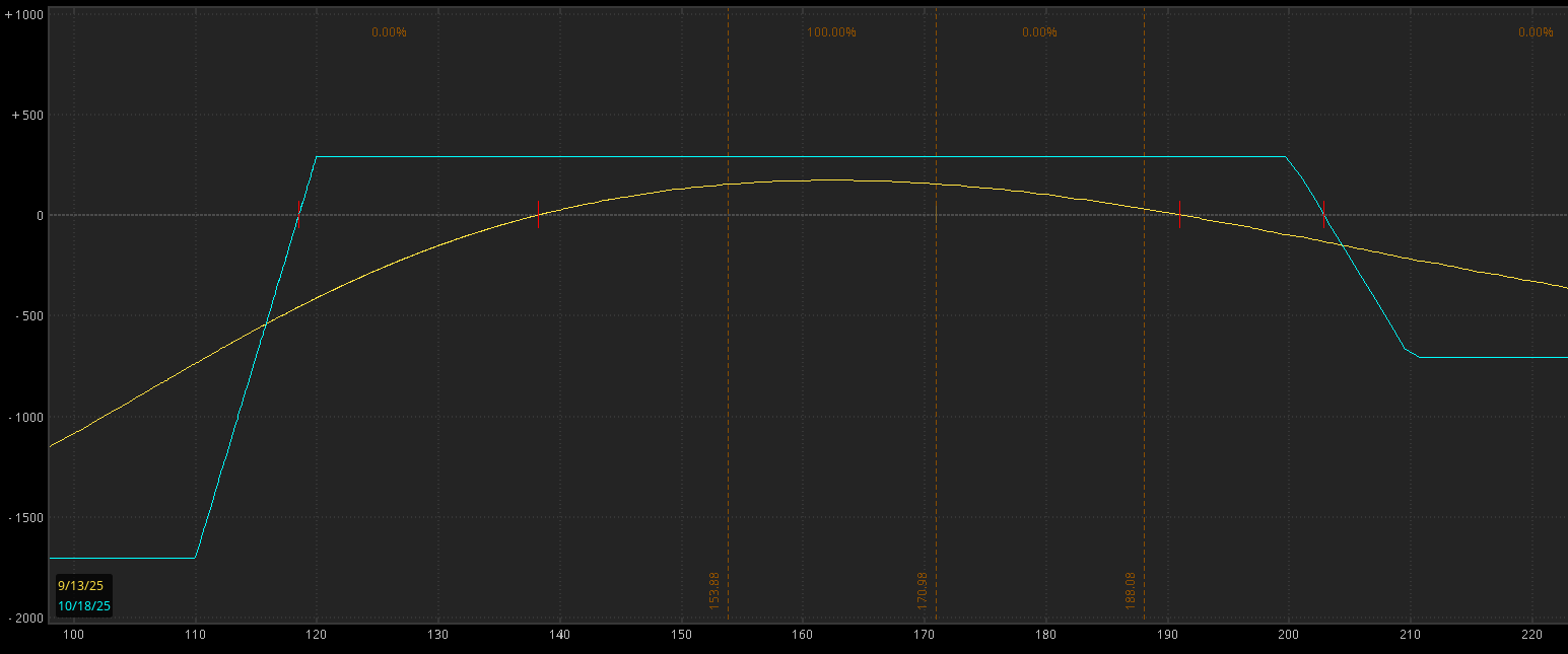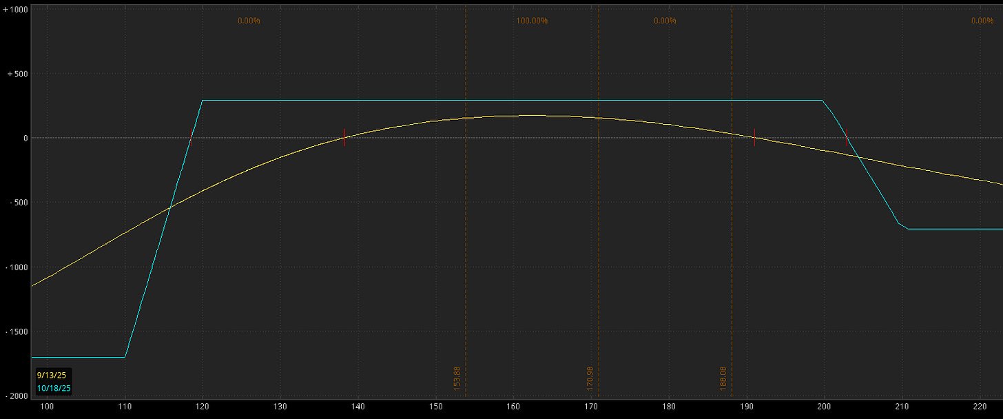 I don’t think sticking around in the trade much longer is a good idea, but if you wanted to milk the trade further, then you’d roll up the put side to higher strikes for a credit, and then get ready to sell another round of call spreads into any kind of parabolic move into 180.