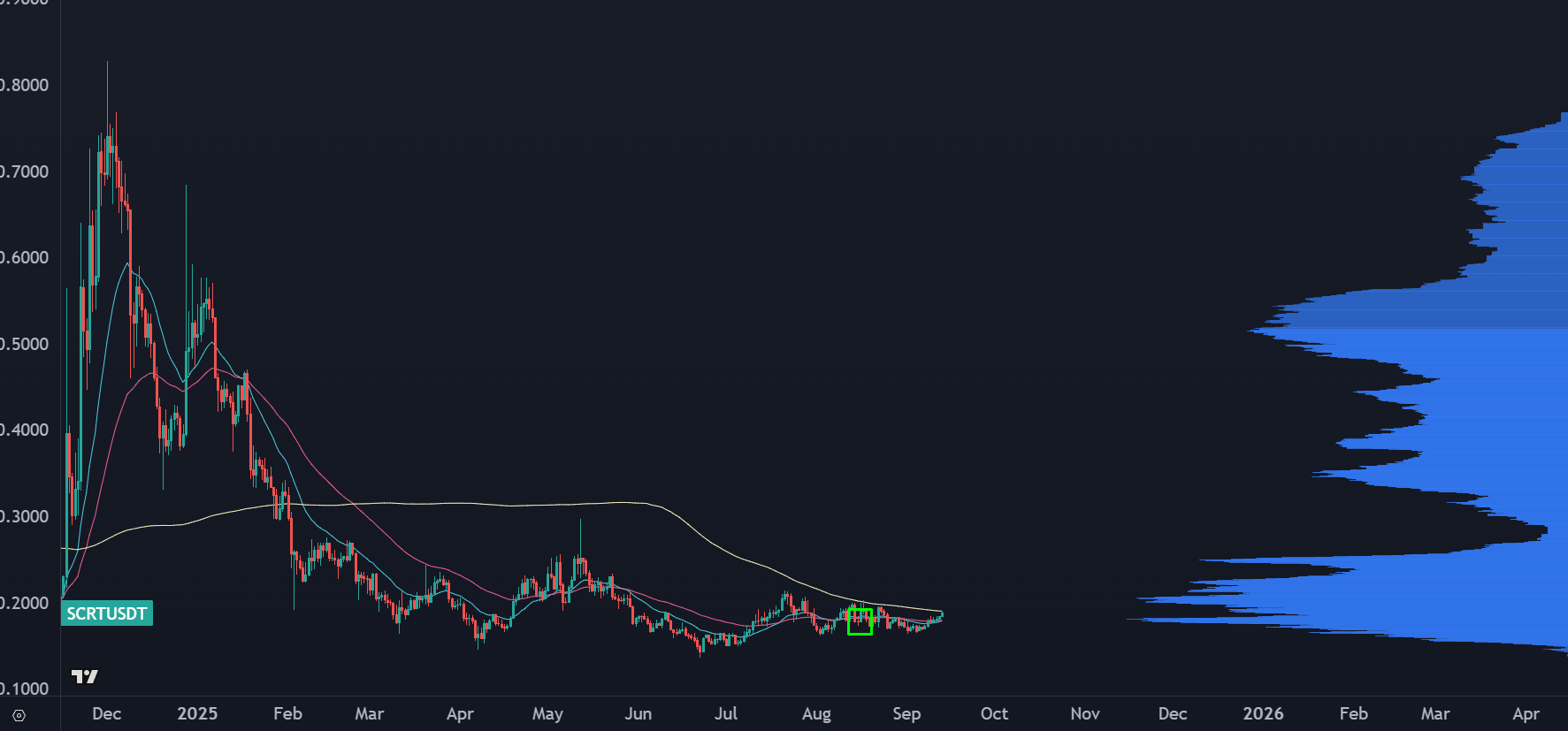 The price alert for SCRTUSDT is at 0.19, and the token’s trading at 0.1884, so a small loss.