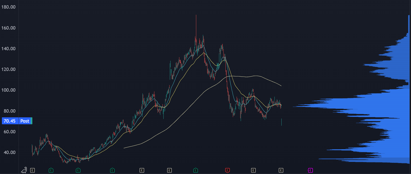 The stock was at $50 back in april, and trading in the 120s now. It just had earnings but couldn’t hold back above 135. The longer it holds under that level, the higher the odds we see a reset down to $110.
