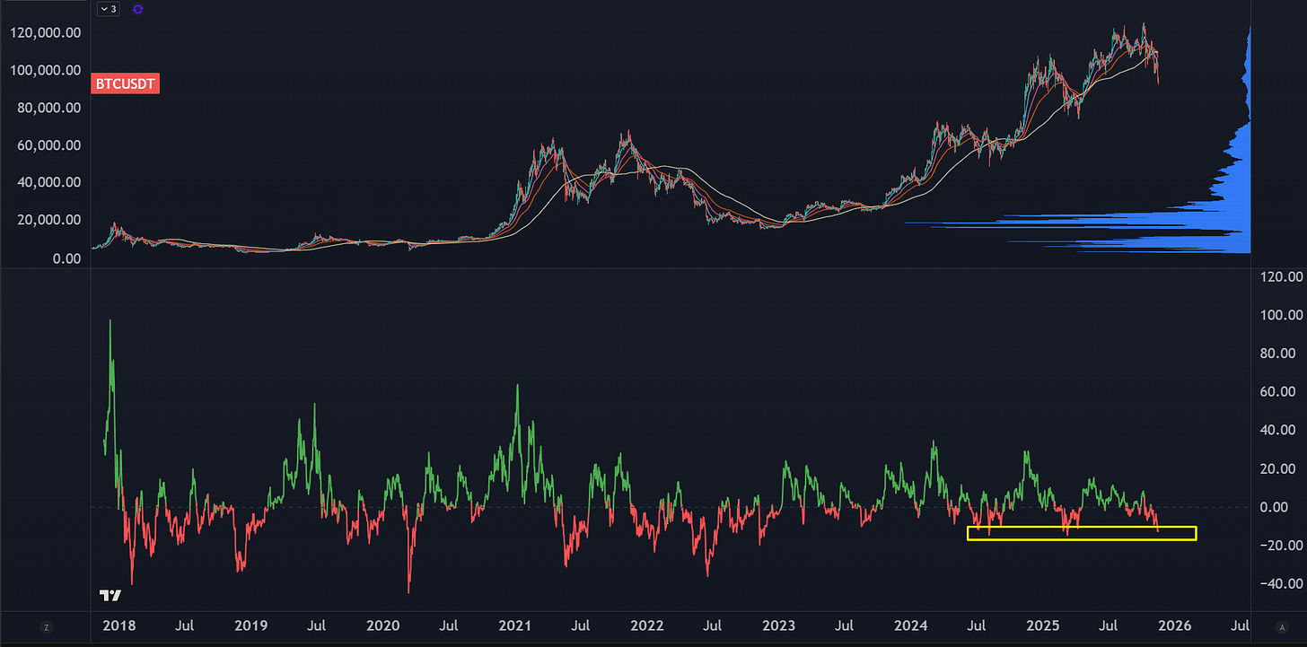 This is the price distance from the 50EMA, which is approaching full reset conditions. It could stretch lower, but this isn’t 2021. We don’t have a huge hangover from the crypto bull craze, and risk assets overall appear to be fine. Crypto is also a much more liquid market, which means we should expect volatility to be reduced.