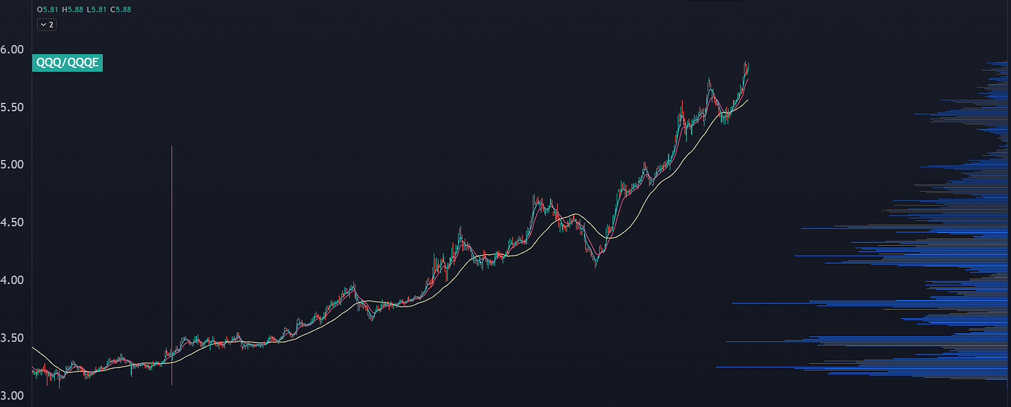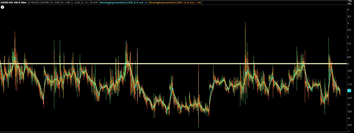 This chart shows the difference between the 9 Day VIX and the 30 Day VIX. I’ve not found a “pure” way to measure the rolling IV for 0DTE options so looking out 9 days is close enough.